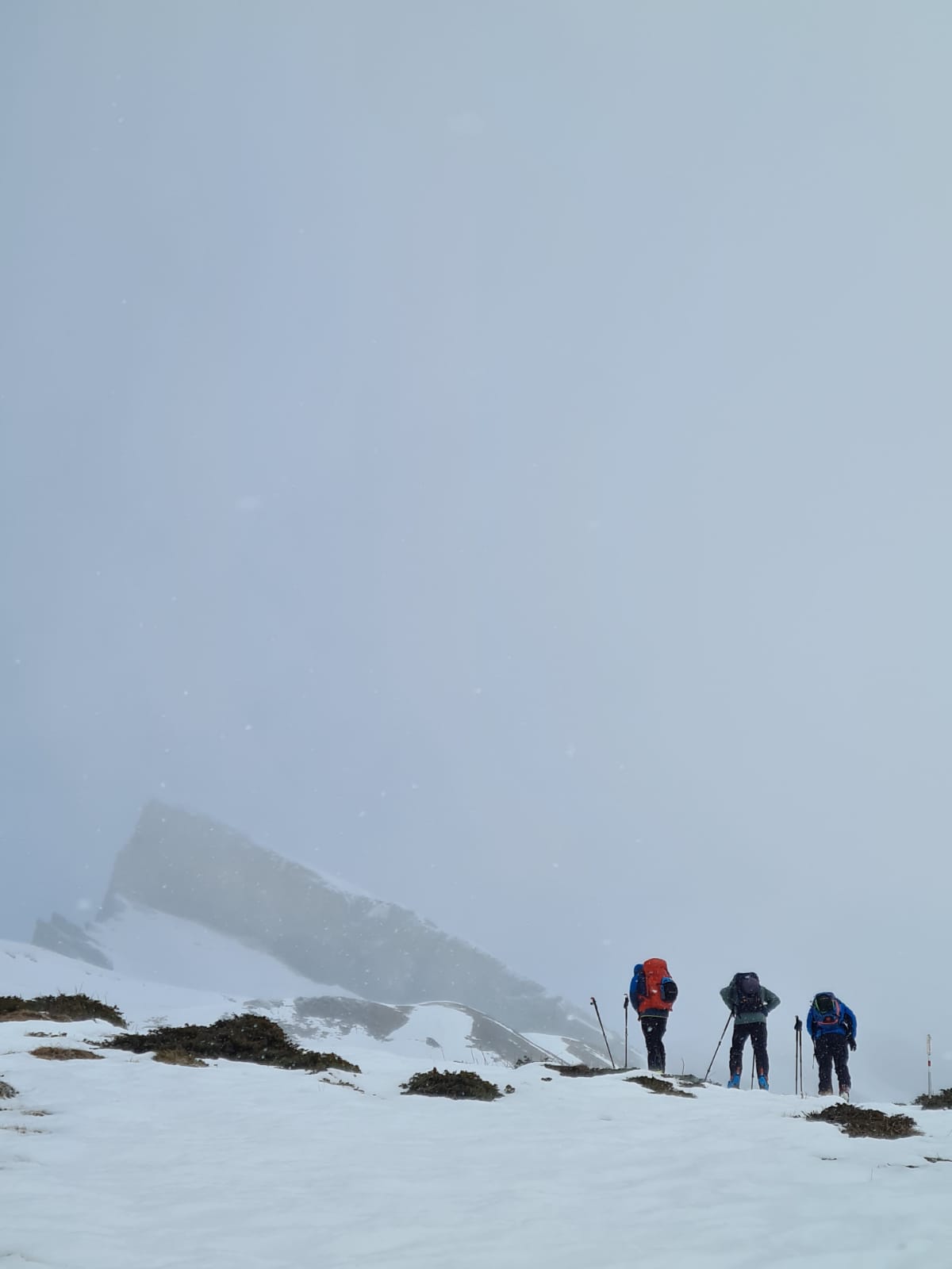 Da die Einsiedler einen etwas weiten Anreiseweg hatten, entschieden sie sich, mit dem Auto anzureisen. Sie luden ausserdem auf dem Weg gleich auch noch Arno aus Uznach auf. Somit trafen wir uns um halbzehn in San Bernardino beim Hotel Bellevue. Bald schon ging es los, zuerst mit den Skis auf den Schultern bis zur Capanna Genziana. Ab dort ging es zuerst mit den Skis an den Füssen ein Stück der Passstrasse entlang bis zur Ponte Nev, und von dort Richtung Westen. Via Alp Vigon stiegen wir bis zum P. 2587 und dann weiter der Ostschulter des Piz de Mucia entlang hoch bis zum Skidepot auf ca. 2850m. Ohne Skis stiegen wir dann auf den Gipfel. Da wir etwas spät dran waren, hatten wir den Gipfel für uns und freuten uns an der Aussicht und am zwar etwas trüben, aber windstillen Wetter.
