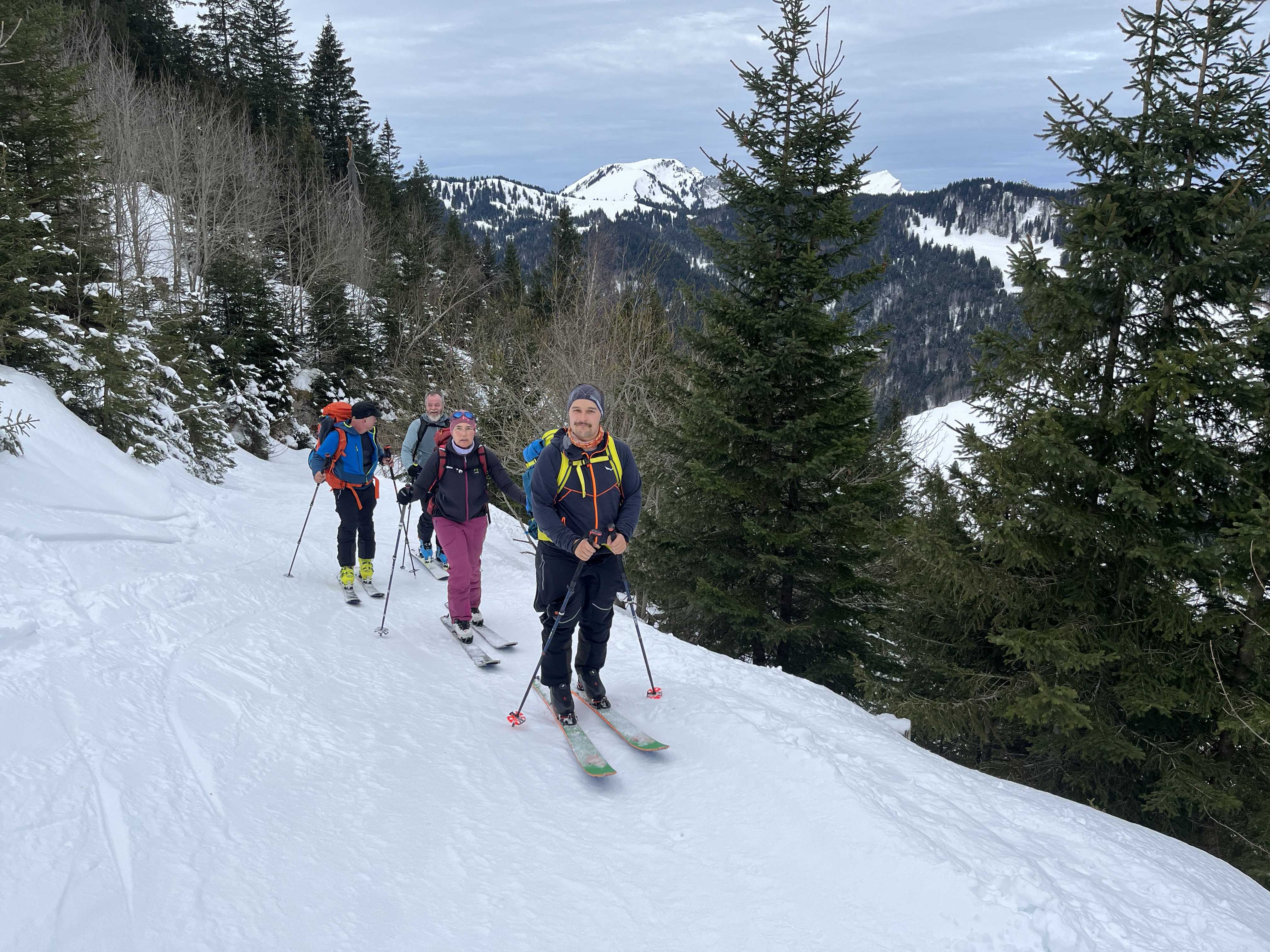 Frisch gestärkt steigen wir ca. in einer ½ h auf zu PKt 1817 südlich von Torloch. Hier machen wir uns bereit für die Abfahrt via Brisizimmer zum Zinggen. Diese Abfahrt erwies sich wegen des bereits nassen, klebrigen Schnees als recht anstrengend. Als wir dann endlich die Langlaufloipe erreichen, konnten wir unseren Skiern wieder freien Lauf bis zum Restaurant Zinggen lassen. Gerade angekommen beim Rest. Zinggen setzte leichter Schneefall ein. Zeit für einen Einkehr Schwung und zur EWF Runde…