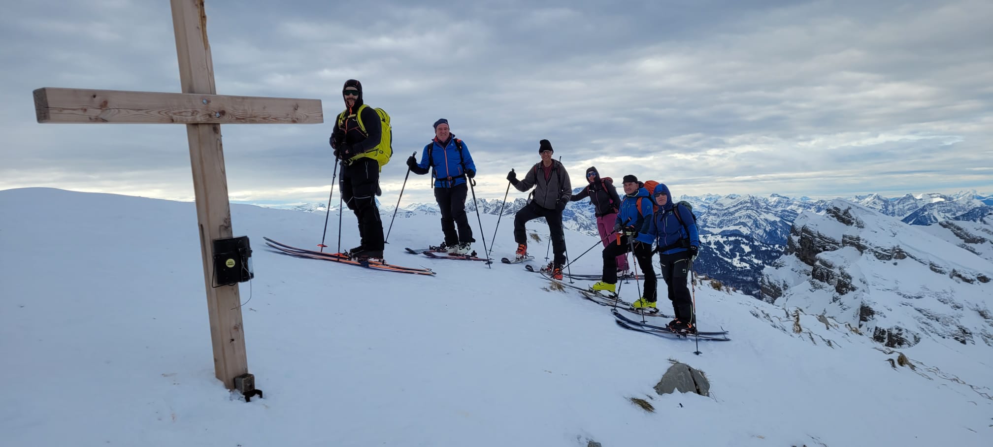 Die Aussicht wäre super! Aber der zeitweise starke Wind lädt nicht zum Verweilen ein. Nach den Obligaten Gratulationen, Fotos und ein paar wärmenden Schlückchen Tee machen wir uns alle zur Abfahrt bereit. Alle? Nein, bei einem Teilnehmer stellte sich ein Defekt bei der Bindung heraus. Eriks Kabelbinder sei Dank und diese Defekte Bindung wurde Notfallmässig repariert.
