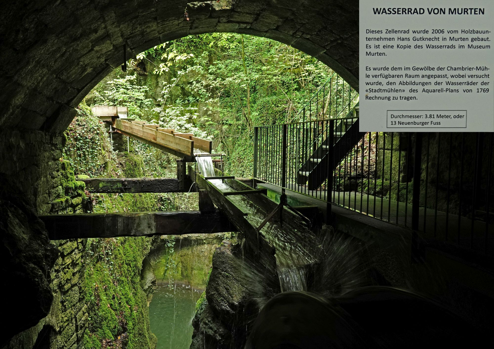 Anschliessend besuchten wir den Schlosshügel mit Aussicht auf die nähere Umgebung. Da der normale Abstieg durch die Seyonschlucht nach Neuenburg auf der Ostseite dem Autolärm der A20 nach La Chaux-de-Fonds ausgesetzt ist, wählte ich den wesentlich ruhigeren Weg auf der Westseite, die 120 Meter Anstieg lohnten sich und bevor wir wieder in die Schlucht abstiegen, genossen wir oberhalb Vauseyon die Aussicht auf Neuenburg, den See und das angrenzende Mittelland. Einzig die Alpen waren in Wolken gehüllt. Im untersten Teil der Schlucht konnten wir im Freilichtmuseum Gor de Vauseyon zahlreiche, nachgebaute Modelle von Wasserrädern aus verschiedenen Teilen der Schweiz bestaunen, die mit Wasser aus dem Seyon und einem aufwändigen Kännelsystem betrieben werden.