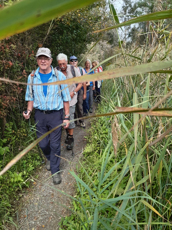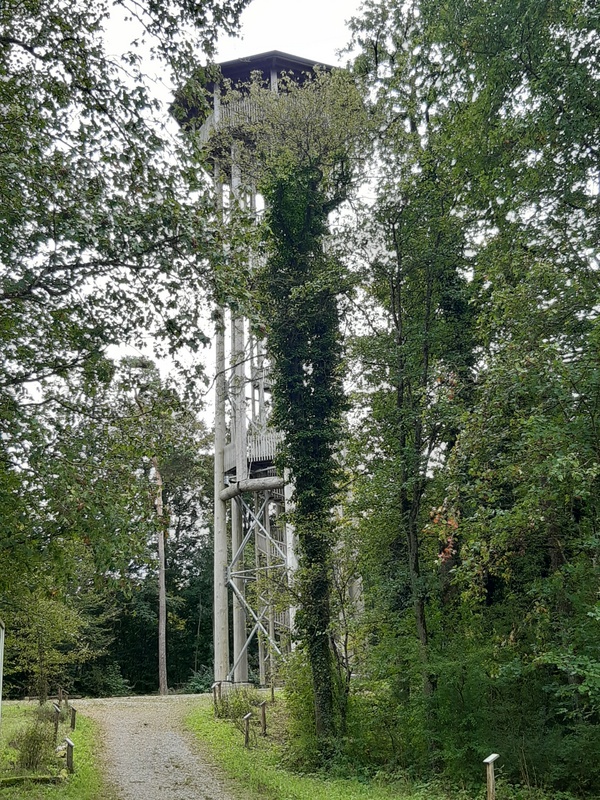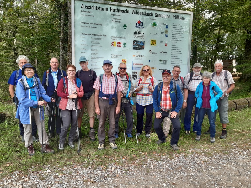 Ankunft Dachsen Bahnhof 0930h. Wir machen uns sofort marschbereit und ziehen mitten durchs Dorf Richtung Laufen. Den Rheinfall zur Linken nehmen wir vor allem akustisch wahr. Alsbald verlassen wir den mit Touristen gut bevölkerten Ort, schlängeln uns am Strassenknotenpunkt Lauferfeld vorbei, Uhwiesen entgegen. Beim Durchqueren des langgezogenen Rebberges bestaunen wir die Reben mit den voll behangenen Trauben, wohl kurz vor der Lese stehend. Durch ein längeres Waldstück meist leicht ansteigend, gelangen wir zum Ursprung unserer Wanderung, dem Wildensbuch-Turm.