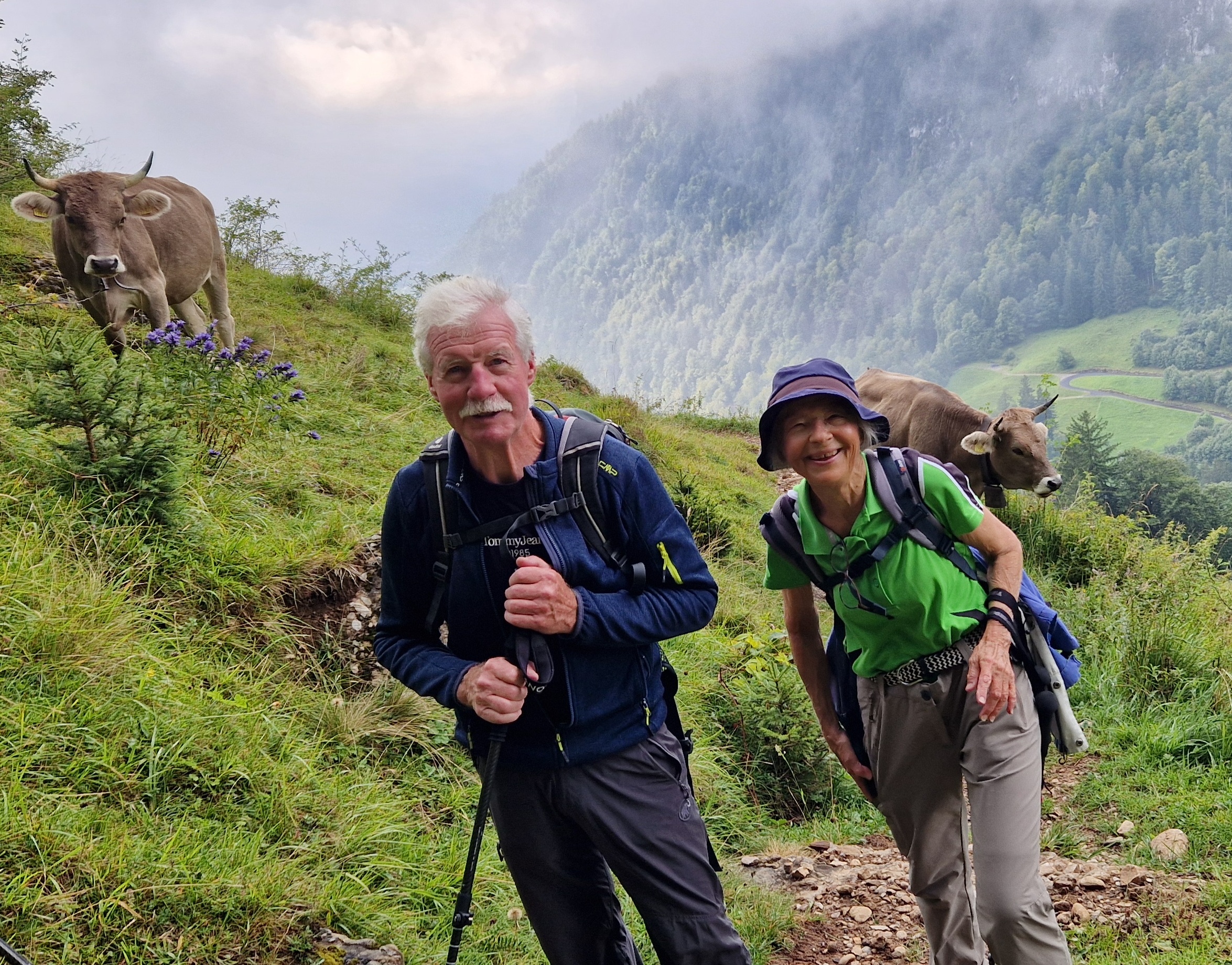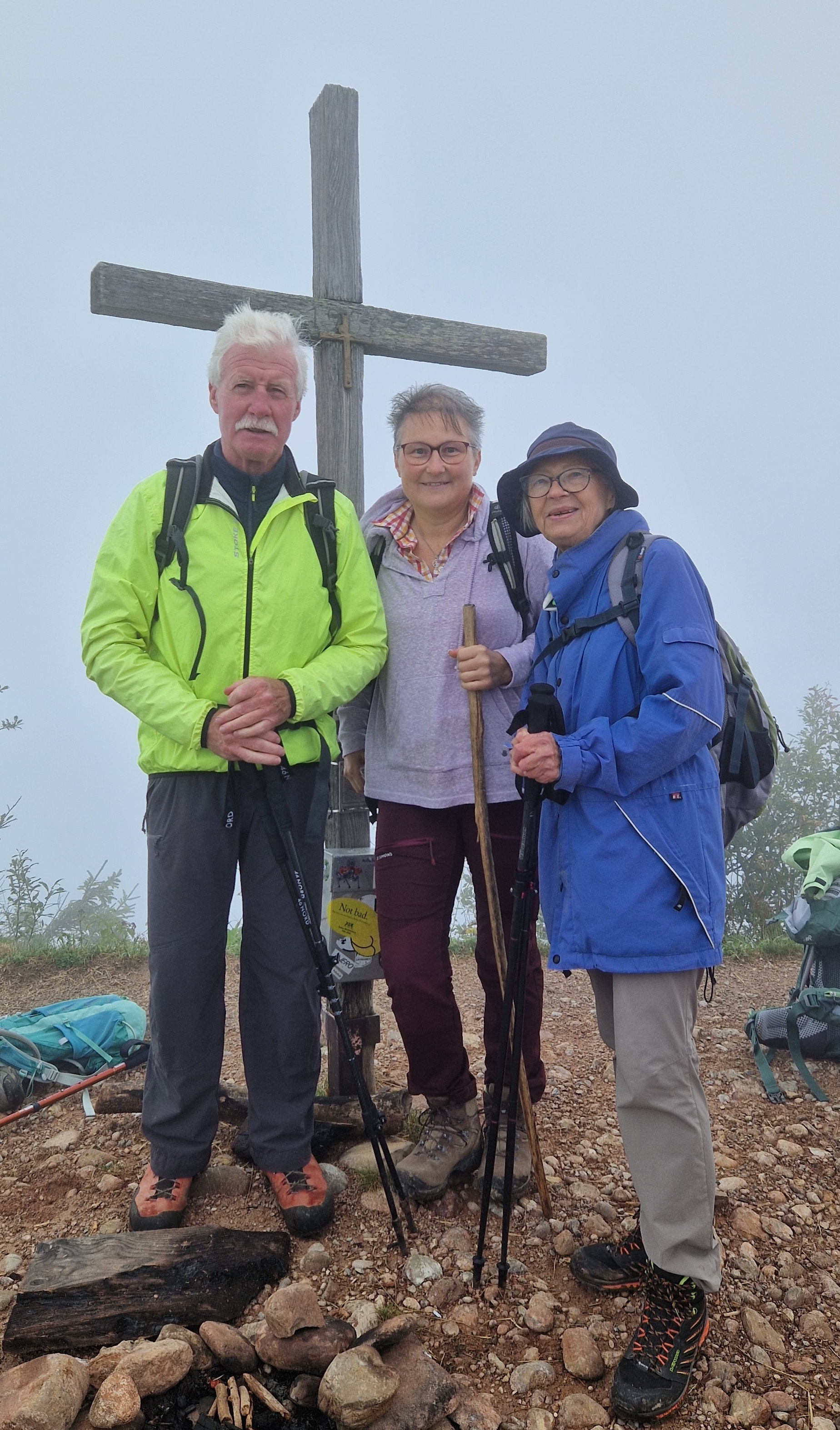 Leider konnten wir nur eine kurze Pause machen unter diesen Bedingungen. Erstaundlich, wie viele andere Wanderer auch unterwegs waren. Die gut 657 Höhenmeter hatten wir in 2 Stunden Marsch gemeistert. Dank unserer kleinen Gruppe und dem guten Wohlbefinden aller Teilnehmenden, konnten wir die Tour wie geplant weiterführen. Volle Konzentration verlangte uns dieser Grat zum Planggenstock. Über feuchte Wurzelstöcke führte unser Weg weiter, rechter Hand gab es steil abfallendes Gelände. Linker Hand wurde der Weg zum Teil mit Seilen gesichert. 45 min. später um 11.45 Uhr standen wir auf dem Planggenstock auf 1675 m.ü.M der höchste Punkt unserer Tour.