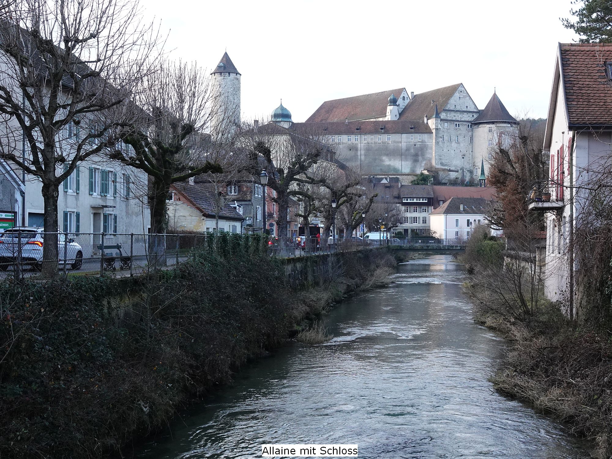 Nach einer kurzen Einlaufstrecke und dem Überqueren der Allaine, dem Hauptfluss der Ajoie, erreichten wir die schön herausgeputzte Altstadt, die den Glanz vergangener Zeiten ausstrahlt. Die Fürstbischöfe von Basel residierten von 1524 – 1792 im Schloss. Durch verschiedene Gassen mit prächtigen Bauten erreichten wir im Strässchen Aux Capucins eine unscheinbare Türe, der Zugang zum internen Aufstieg zum Schloss: Über eine massive Holztreppe, einen Verbindungsgang und eine metallene Wendeltreppe erreichten wir den dreieckförmigen Schlosshof. Im Schloss sind die Gerichte des Kantons Jura untergebracht. Das Gefängnis wird wegen schlechten Haftbedingungen nach Moutier verlegt. Für die Besteigung des Refous-Turms führt die erste Treppe aussen herum. Im Innern ist eine schwache Beleuchtung eingerichtet, so dass man die hohen Tritte mit den Füssen ertasten muss. Zuoberst belohnt die schöne Aussicht auf Stadt und Umgebung die Anstrengung.