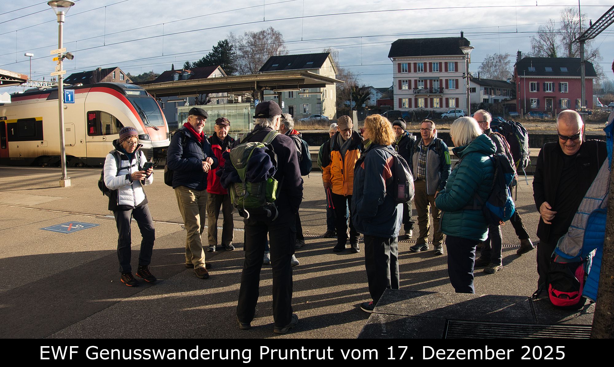 Die Idee, bei meinen künftigen Wanderungen mehr auf das Erlebnis als auf Dauer und Höhenmeter zu achten, hat bereits für diese Wanderung eine stattliche Anzahl Teilnehmende angelockt, trotz der langen Anreise. In Biel besetzten wir im Speisewagen alle freien Plätze für den Startkaffee bis Delémont. Zur Entlastung des Kellners verteilte Jose die Tassen und ich übernahm die Bezahlung als Kurt Nussbaumer Runde. In Delémont wurde der Anschluss nach Porrentruy trotz unserer Verspätung aufrechterhalten und durch Umsteigen am gleichen Perron erleichtert.