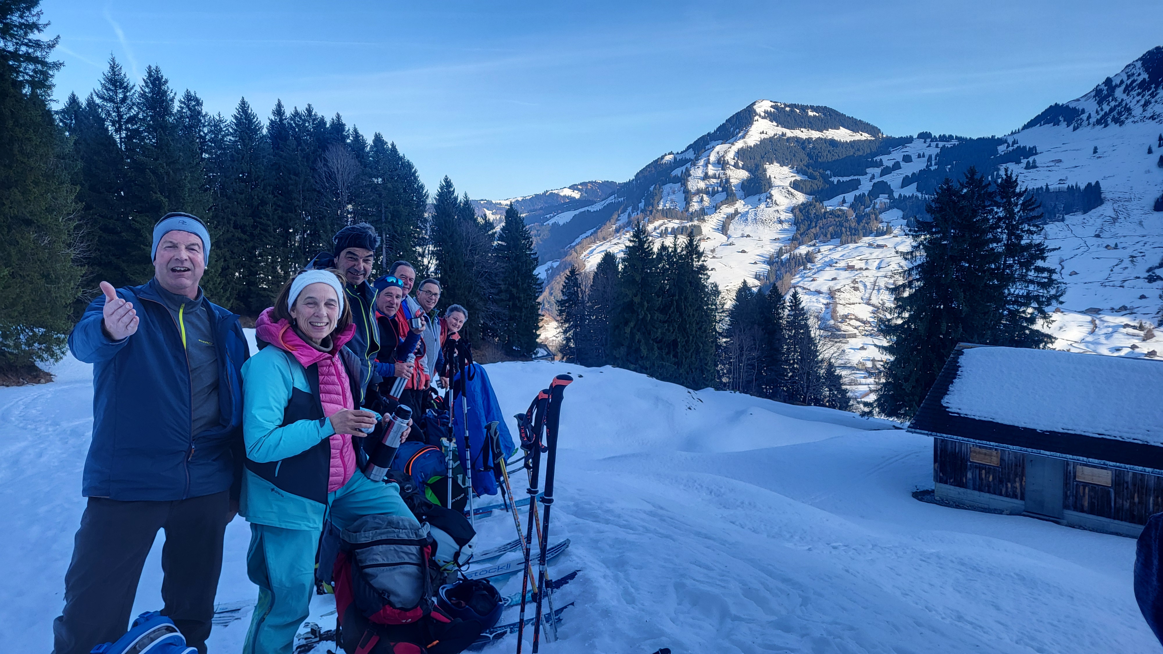 Bei für die Jahreszeit zu milden Temperaturen und in den ganzen Alpen unterdurchschnittlich zu wenig Schnee setzte sich die Gruppe langsam in Bewegung leicht ansteigend dem Dürrenbach entlang bis zum Waldrand wo es Tenüerleichterung gab. Weiter gings auf dem Strässchen entlang, später auf dem Wanderweg zur Waldlichtung Dürrebach wo es eine Pause gab.
