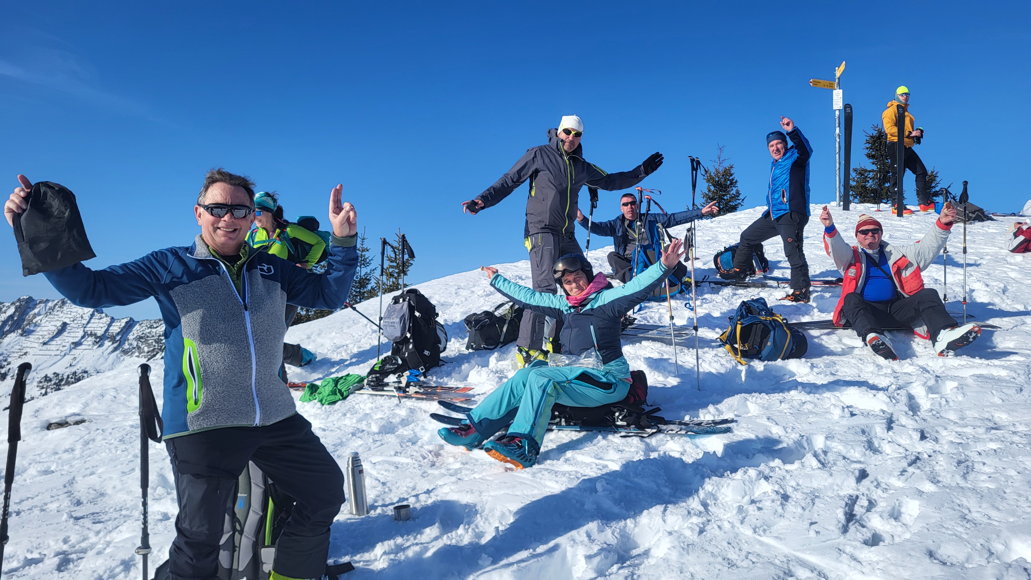 Ab jetzt alles im Wald, die Tannenbäume grün ohne Schnee jedoch am Waldboden genügend von der weissen Pracht an der Vorder Höhi vorbei. Weiter auf dem Wanderweg an der Schlüsselstelle vorbei wenn`s viel Schnee hat, was aber heute kein Problem war da der Schnee an diesem Südhang dem Boden und den Steinen fast zu 50% !! platzt machen musste. Gut auf dem Gipfel angekommen genossen wir die Rucksackverpflegung, die tolle Aussicht und die Flasche Wein von Hanspeter, Merci vielmals 😊.