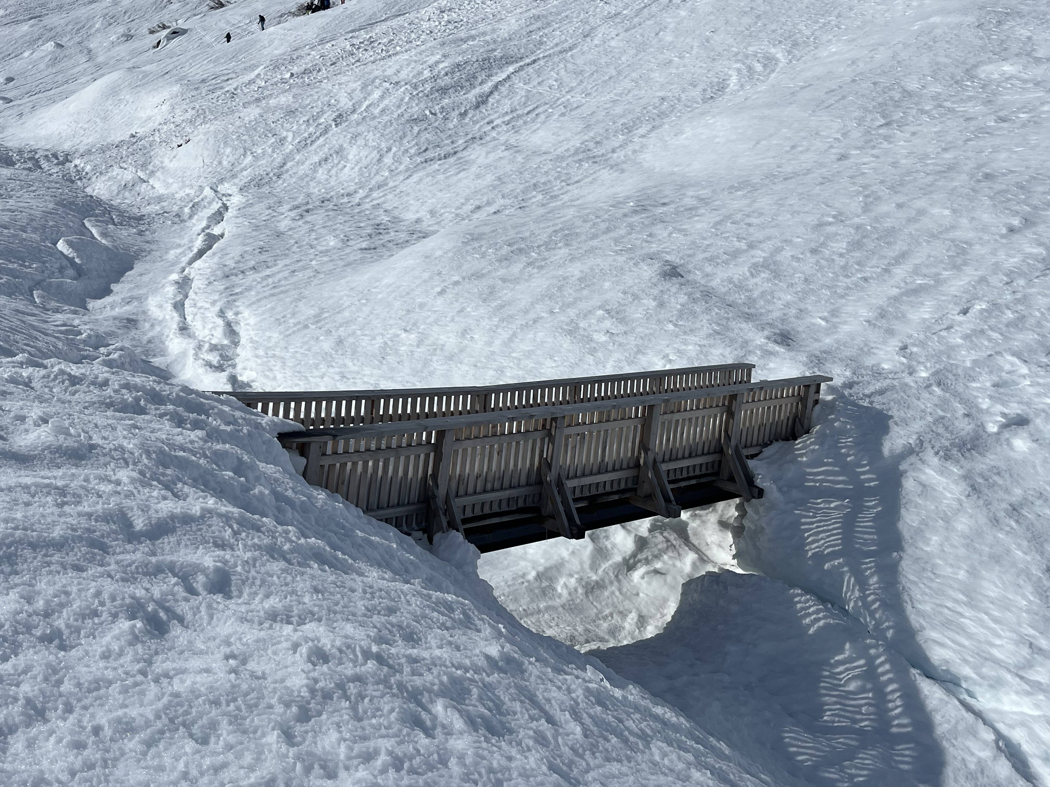 Eine Ratrac Spur welche Richtung St.Antönierjoch führt gibt uns Rätsel auf, für welchen Zweck diese wohl dient? Bequem steigen wir in dieser Spur auf und erreichen in weiteren ca. 45min das St. Antönierjoch. Oder ist es etwa das Gargällerjoch. Schlaue Köpfe vertreten die Meinung, je nachdem von welcher Seite man kommt, heisst es so oder anders…!