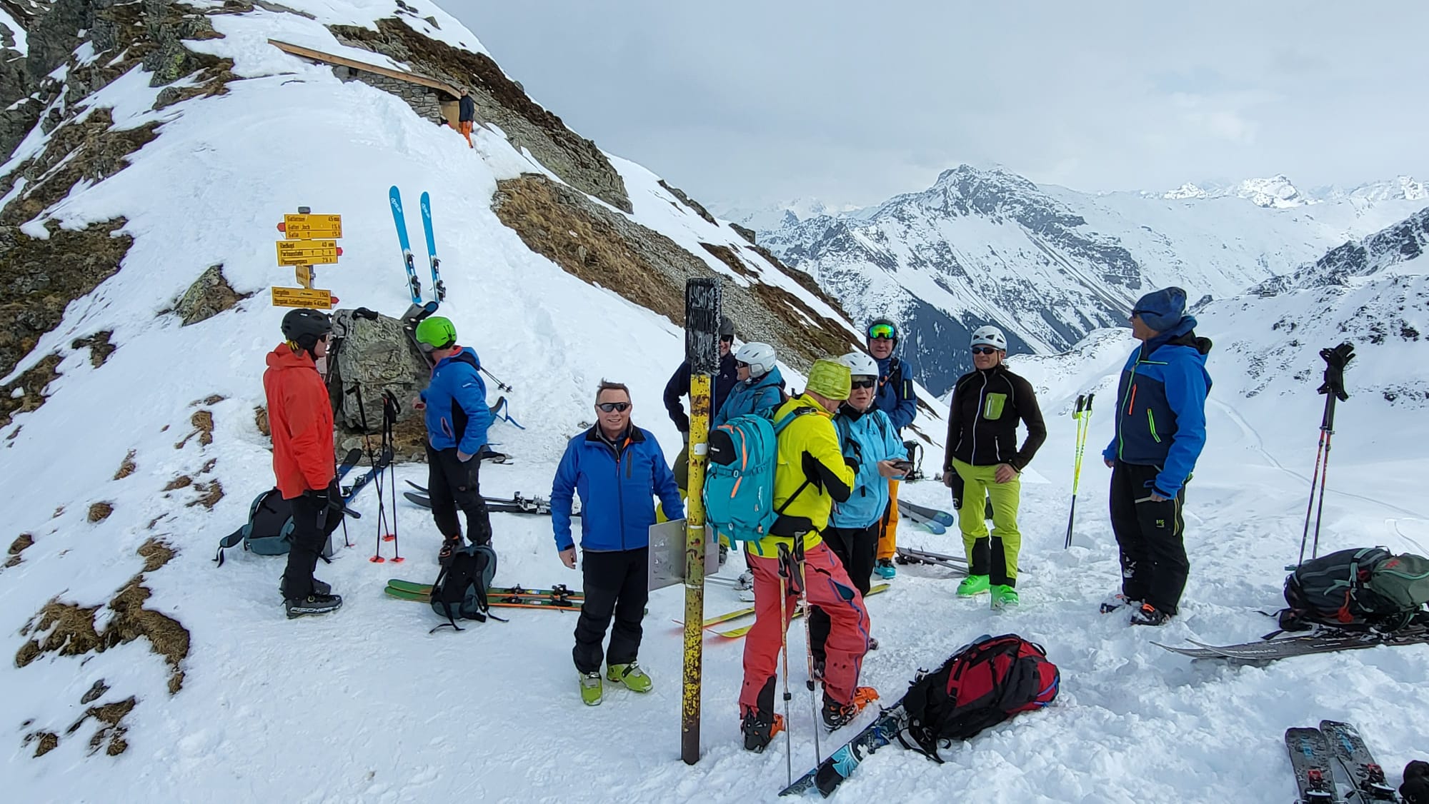Bequem lassen wir uns auf eine Höhe von 2388m befördern. Hier beginnt die eigentliche Tour. Nach einer kurzen rasanten Abfahrt auf der Piste heisst es bei ca.2150m anfellen. Nach knapp 45 Minuten erreichen wir das Schlappinerjoch und überschreiten dir Grenze nach Österreich. Weil bereits die gesamte Nordflanke des Schlappin Spitz bereits Tage zuvor als riesige Lawinen abgegangen war, war dieser Schlüsselstelle bei diesen doch immer noch kritischen Lawinenverhältnissen (2+) Problemlos zu befahren. Beindruckend wie sich die Schneemassen im Talboden meterhoch auftürmten. Weiter ging die Abfahrt durch das Valzifenztal Richtung Gargellen.
