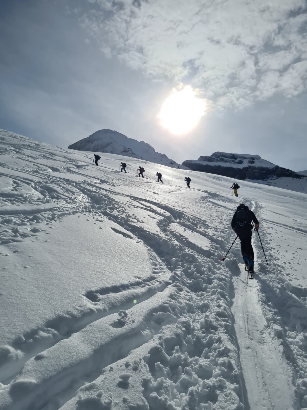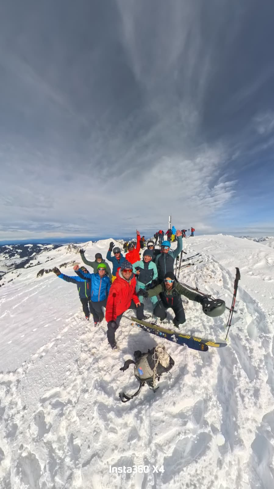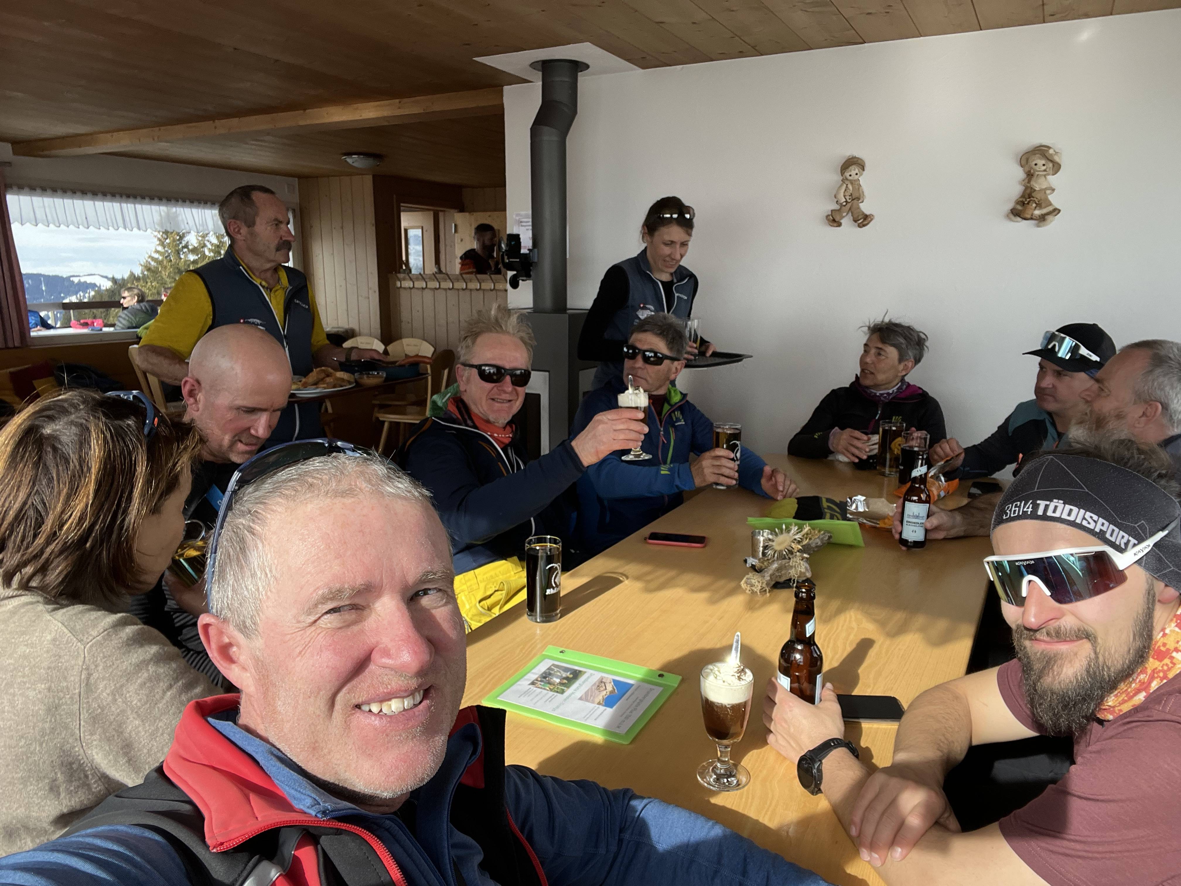 Trotz den vielen anderen Leuten bietet der Gipfel genügend Platz für eine Ausgiebige Gipfelrast. Auch das Wetter meint es weiterhin gut mit uns und wir geniessen die Aussicht… Für die Abfahrt bietet sich nur die gleiche Route an wie für den Aufstieg. Und die weiten offenen Hänge bieten genügend Platz für unsere eigenen Spuren. Der Schnee ist erstaunlich gut und pulvrig zum Fahren. Bei der Druesberghütte machen wir einen Einkehrschwung und genehmigen uns eine EWF Runde.