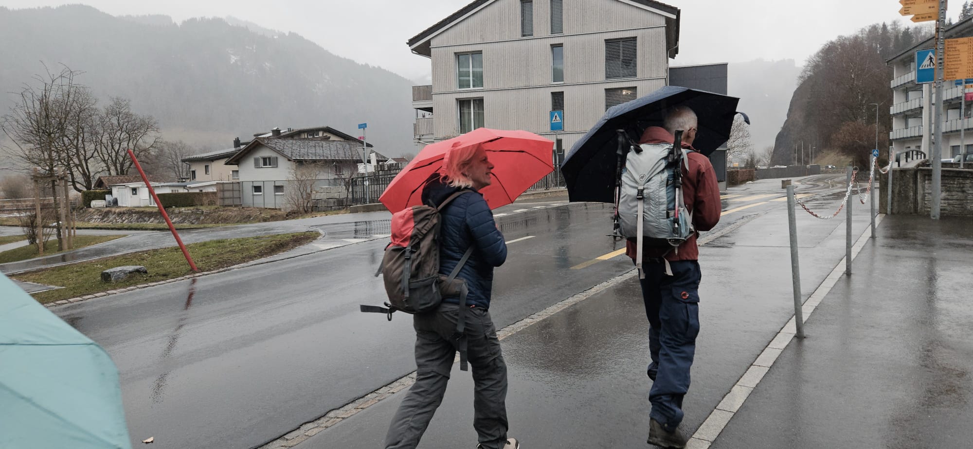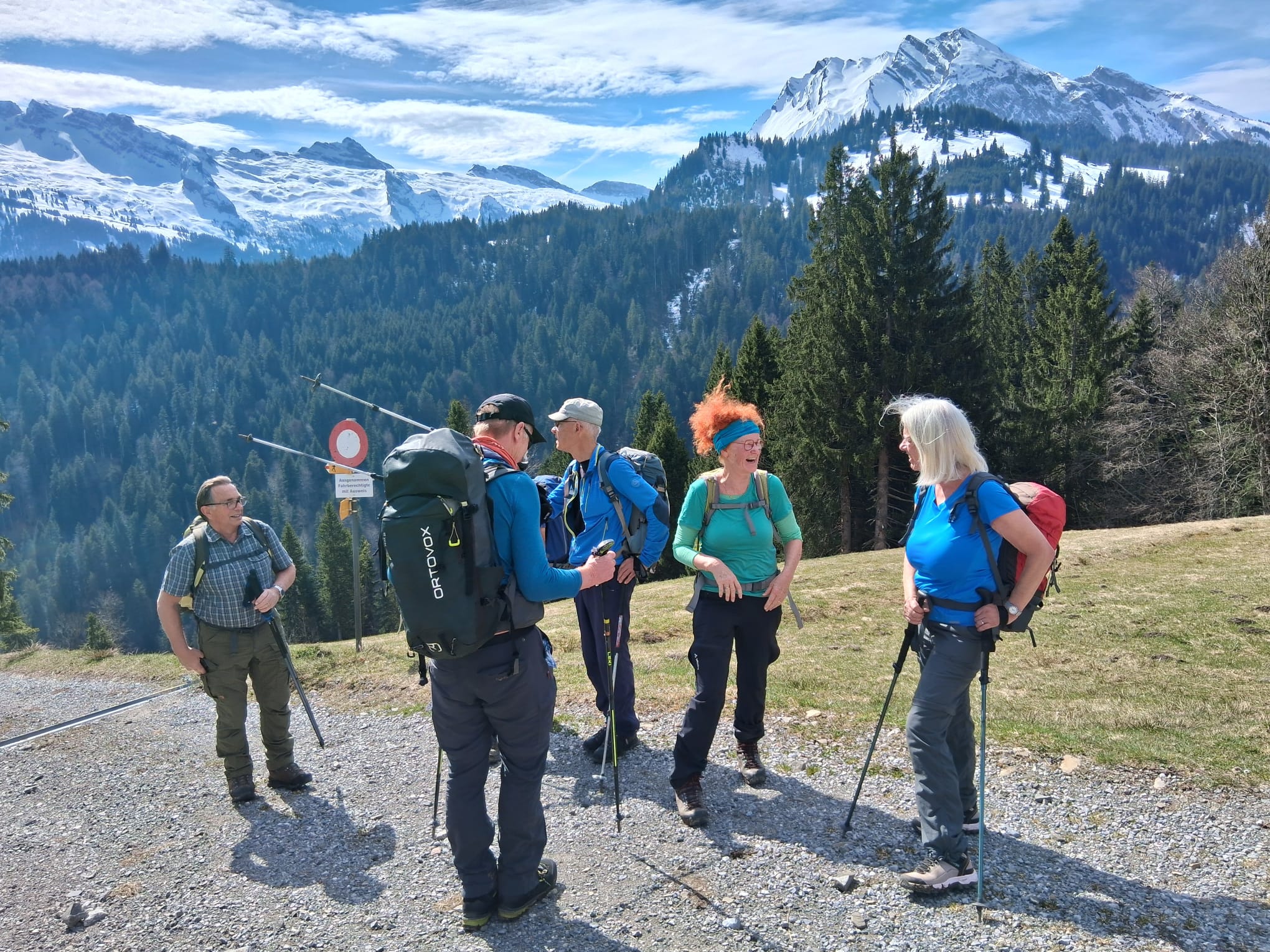 Treffpunkt war Innerthal Post. Zuerst gab es aber eine Café im Bistro zum See. Erfahrungsgemäss mussten in der Regel noch einige nach der Anreise aufs WC, was sich gut kombinieren liess. Zudem hatte der Schreibende bei der Reko-Tour das Café organisiert, respektive es wäre am Mittwoch zu gewesen und die Cafetière Christine hätte frei gehabt. Sie meinte, wenn wir kämen und sie ja sowieso die Arbeiter zum Znüni hätte, mache sie extra für uns auf. Deshalb nutzten wir das tolle Angebot.