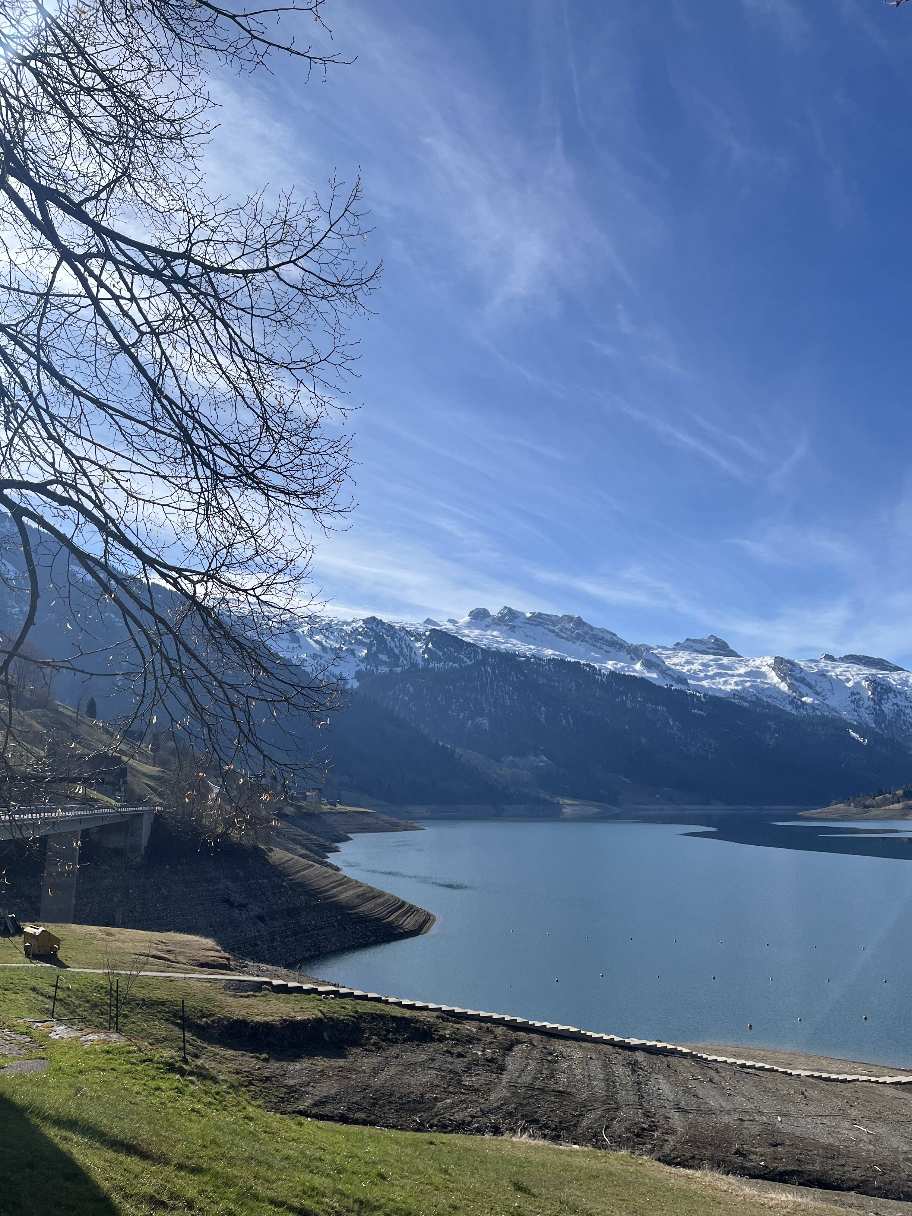 Nach der Stärkung umrundeten wir über die Staumauer ein kurzes Stück des Wägitalersee. Beim Brandhaltli zweigte ein Wanderweg ab der die ersten 300 Meter ziemlich steil hinauf führte. 200 Meter höher flachte es zum Glück etwas ab, über ein bequemes Alpsträsschen geht es weiter hoch, um dann nach einem weiteren kurzen Waldstücke über eine Alp Weide zum Eggstoffel zu gelangen, wo wir eine erste Pause einlegten und die Aussicht auf die noch tief verschneiten Berge des Wägitals , wie der imposante Fluebrig, oder weiter hinten, der Zindelspitz und die weiten Hänge des Mutteristockes, bewundert werden konnten.